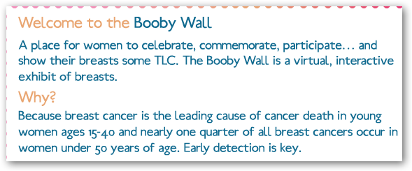 Once women examine their breasts, they are being asked to take photos of their breasts -- whether fully clothed, in a bra or topless -- and upload those pictures to the Booby Wall at the Web site www.boobywall.ca.