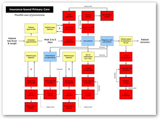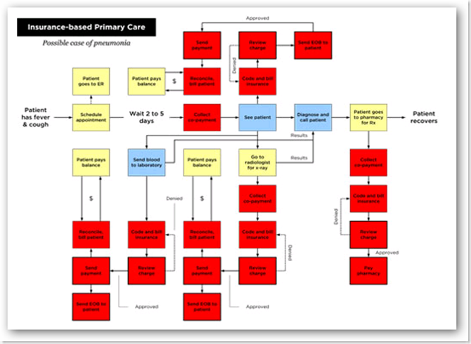 Today's insurance reimbursement process is an impediment to the delivery of affordable, patient-centered primary care. To get paid, your doctor has to meticulously track everything he does—and why—then navigate an incredibly complex system of billing codes that is prone to error. He'll have to negotiate and resubmit charges when the insurance carrier denies payment, which it often does. And when he finally gets paid for your visit, he'll get a low contract rate—about $50–$70 in Seattle. It's no wonder that today's primary-care doctor has to see so many patients each day just to make ends meet.