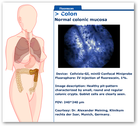 The group found a short protein that sticks to colon cells in the early stages of cancer. Before screening a person, they spray that short protein attached to a fluorescent beacon into the colon. The protein then gloms on to any cancerous cells and creates an easily visible fluorescent patch. They then used a miniaturized microscope called CellVisio, developed by Pennsylvania-based Mauna Kea Technologies and loaned to Contag, to peer inside the colon and look for those telltale spots.