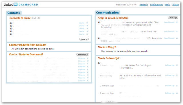 And the other feature I like is the dashboard...it helps keep me up to date on my emails and tasks. The names have been erased here to protect the innocent...but this is definitely helping me stay on top of my emails and correspondence. Again, I have yet to add anyone to the network but I am sure enjoying the toolbar features. If you live in Outlook like I do, give this one some serious thought...I read recently where Bill Gates is now on Linked In...BD