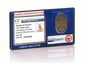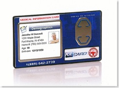 I ran across their booth at HIMMS and they had just announced their new product...the size of a credit card and it had data. There will be an option to lock the information, but this was meant to be an emergency card to show your medications, current x-rays, etc. in case of an emergency. It had a mini USB connector for use with a PC. The product is not yet up on the website, but you had a general health record with contact information, medical conditions and images for use. The card was only a small bit thicker than a credit card. Anyway, I was very much overall impressed with the card as it fits easily into a wallet, just like a driver's license or credit card. All you need to do to read and activate was a simple push button on the right hand side...nice work..and even the small versions of images were visible on the screen....BD