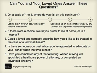 Silly? Maybe. But it underscores how having a template like this – just five questions in plain, simple language – can deflate some of the complexity, formality, and even misnomers that have sometimes surrounded the end-of-life discussion.