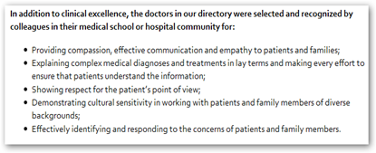 One point of clarification: We have two programs which recognize physicians in different ways. While they both uphold exemplary doctors, physicians who receive Gold DOC recognition are identified by grateful patients. Any patient can visit our website and submit a request to recognize their Gold DOC, who will then receive a plaque and "Humanism in Medicine" lapel pin, free of charge to both patient and physician. We will also post the doctor's name to the Gold DOC page on our website. We encourage all patients who want to thank their doctor for the compassionate care to take advantage of this opportunity. Doctors tell us that recognition by their patients is the most important type of award they receive.