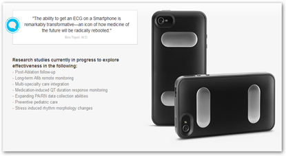 in other words this is not intended as a consumer product yet. The next 501k approval is needed from the FDA to make that move. It detects arrhythmias and in time prescriptions for the device can be made by doctors for those who have atrial fibrillation and are under medical treatment plans. Again they are in pursuit of having an over the counter device available sometime next year. The device snaps onto an IPhone like a case and there’s no wireless pairing required.