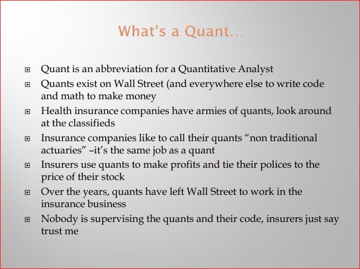 The bottom line here is that the AMA and United Healthcare are making complete fools of everyone thinking that some brainchild coding is going to change anything, as it won’t, it will more than likely end up costing more money as of course it will end up requiring software updates, right…LOL…and the AMA will get paid royalties for creating new CPT codes that will have to go along to match the ICD diagnosis codes so doctors can get paid to throw you under the Bad Algo Coding bus where you will not only see potential limitations in care today, but this will follow you forever and make it harder for you to jump through more algorithmic hoops that the Quants will model. If you’re not getting this, then watch my video at the link below and then continue on to watch the 4 videos from others and see how far down in the algo toilet you might be.