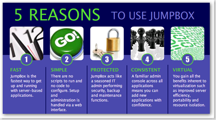 SAVE TIME – A JumpBox is the fastest way to get up and running with server-based applications. With JumpBox there is none of the “heavy-lifting” typically involved in manually installing server applications – saving you hours.