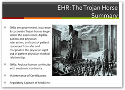 Here’s a presentation on the medical record Trojan horse by Dr. Craig Wax. Again he’s talking about how it works for doctors and the stimulus money and a view from how a practice looks at it. We know of course that electronic medical records are here to stay, but what kind, how complex and where did the doctors get left out? I wrote an early medical records program and it was for the doctors but now payers are involved and made the entire process very complex and they are making money by doing this. Money in coding and documentation is over ruling good healthcare.
